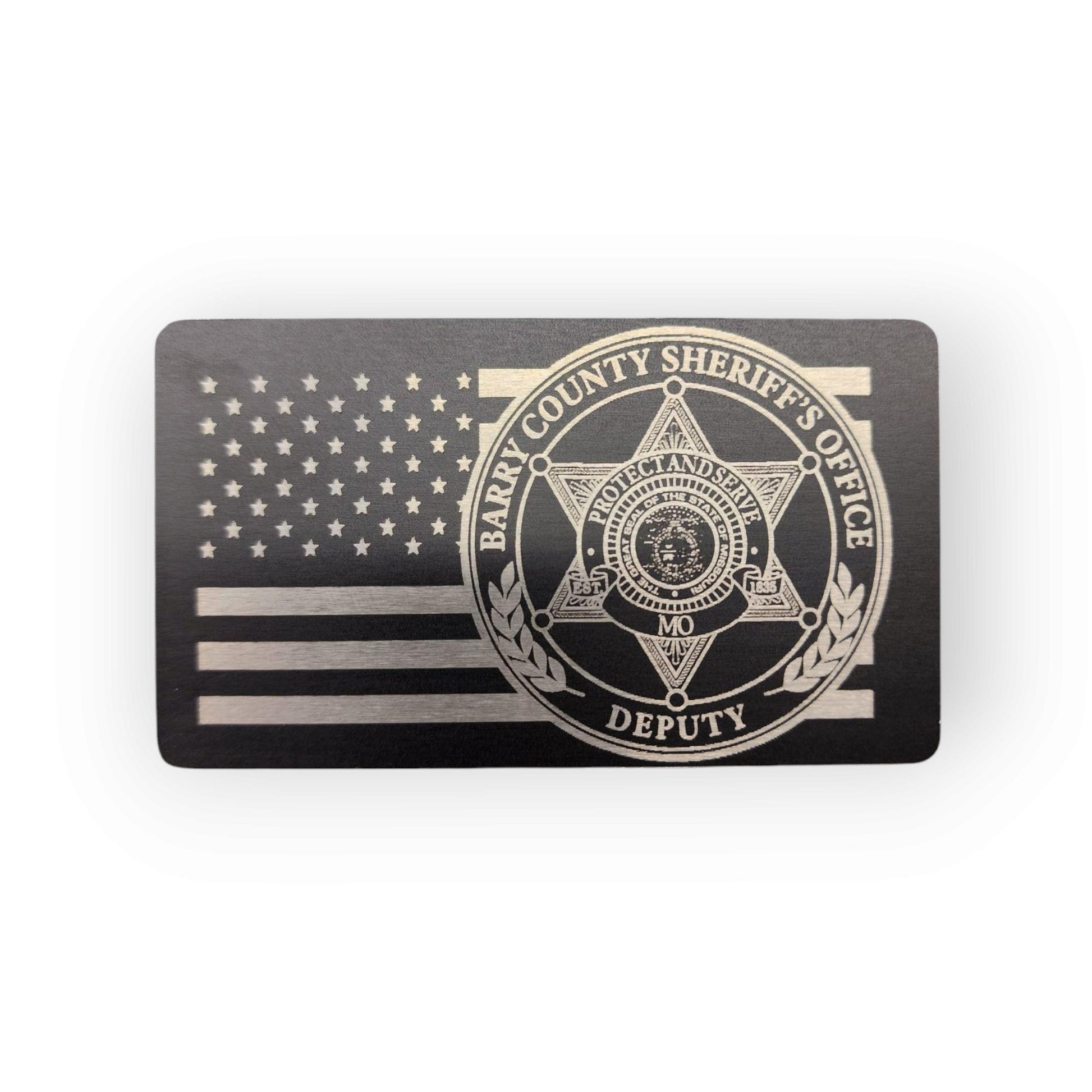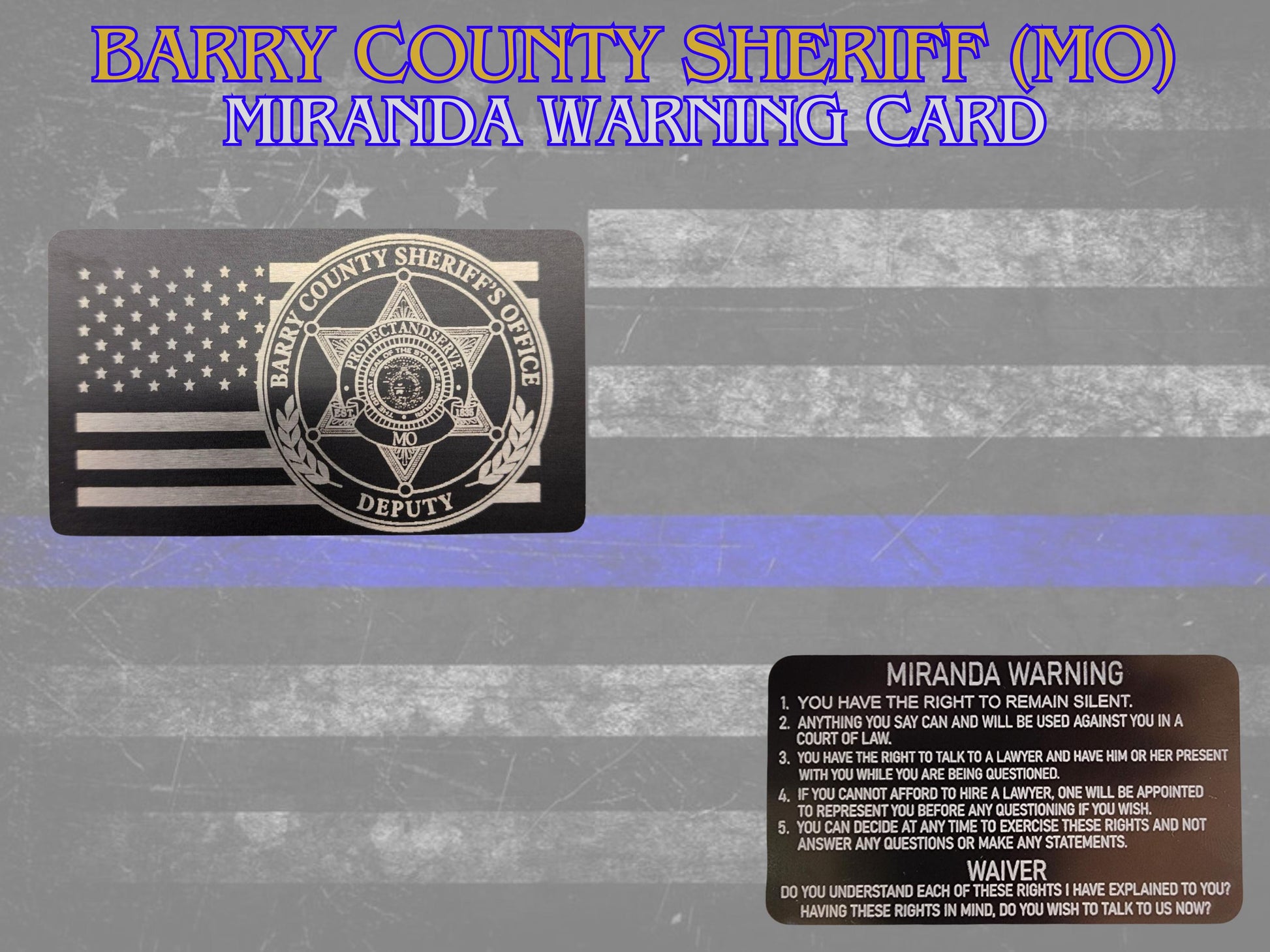 Barry County MO Sheriff's Office! Durable anodized aluminum Miranda warning card. Don't rely on a paper card when you can carry this. The front is engraved with the Barry County Sheriff's Office (MO) badge, customized with your badge number. The back will contain the full Miranda warning and waiver.