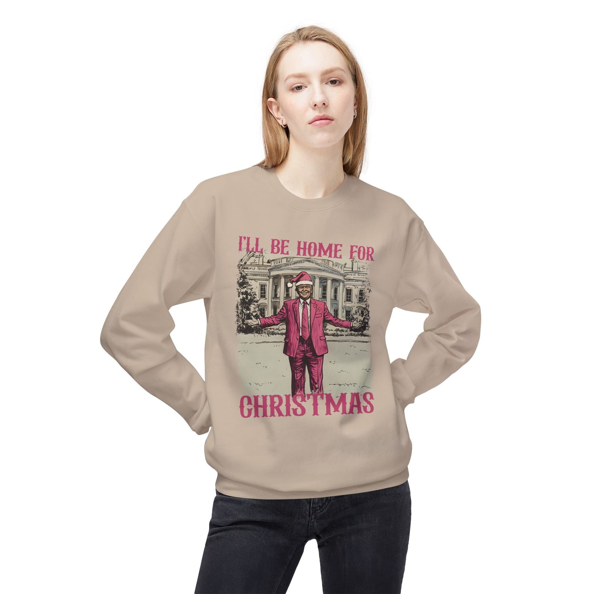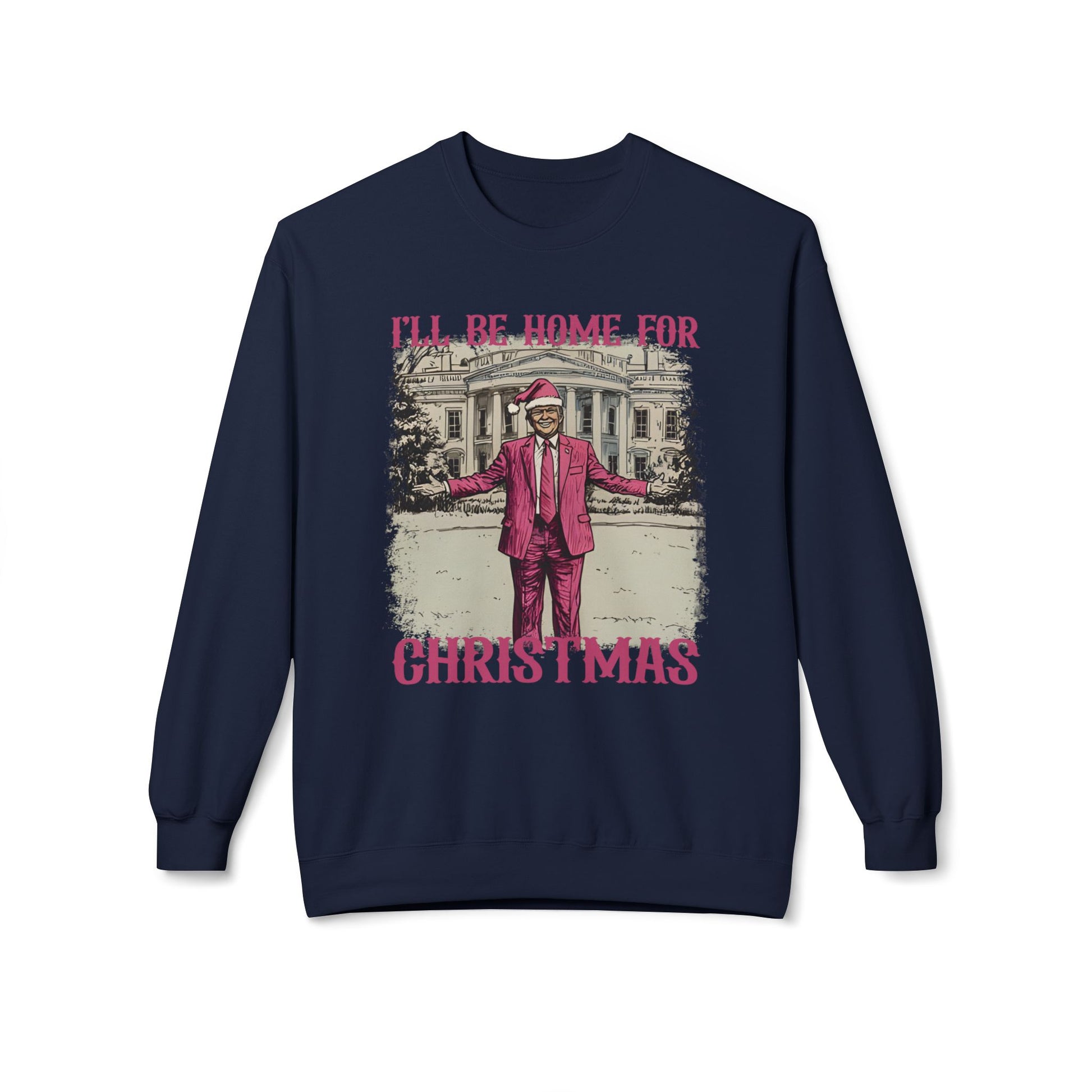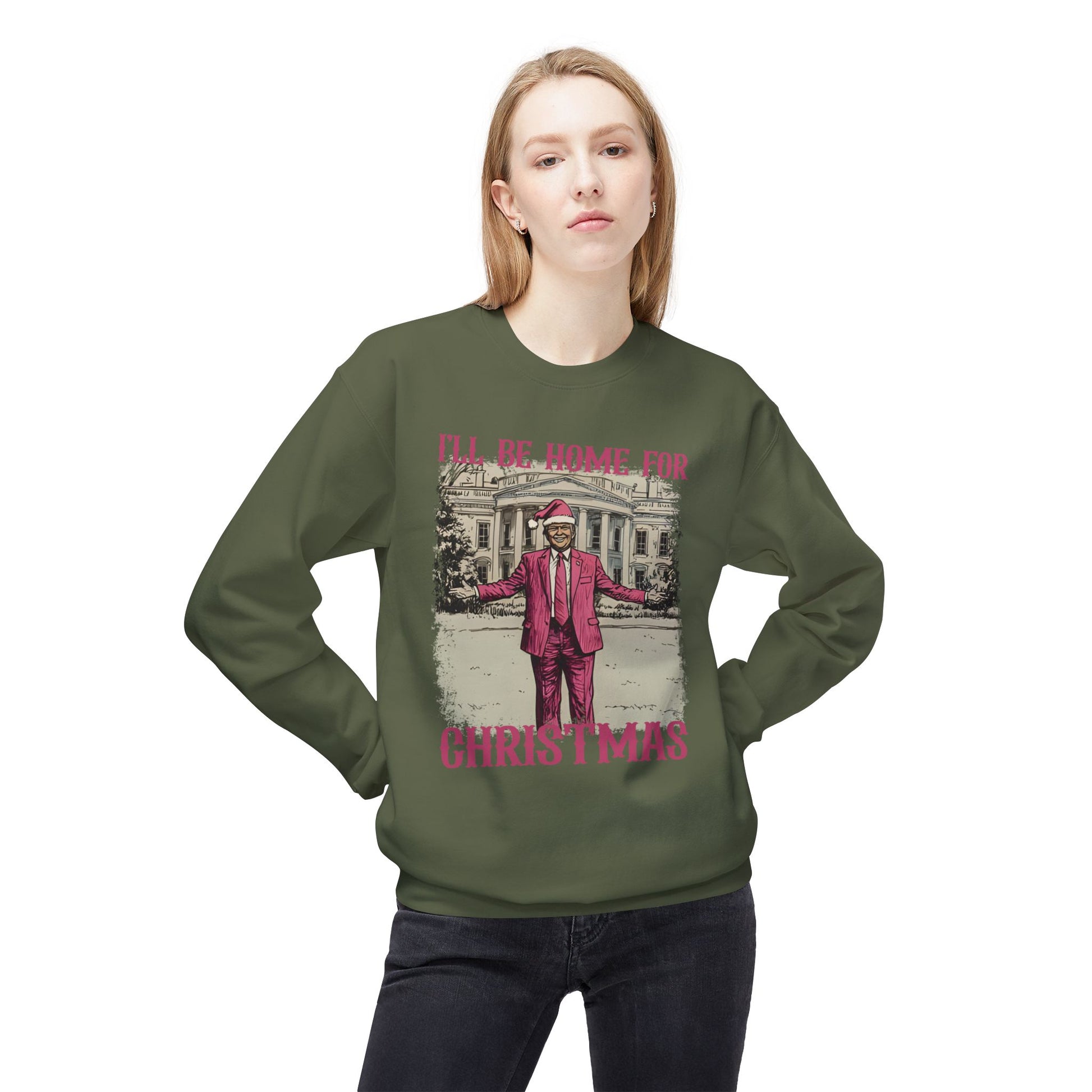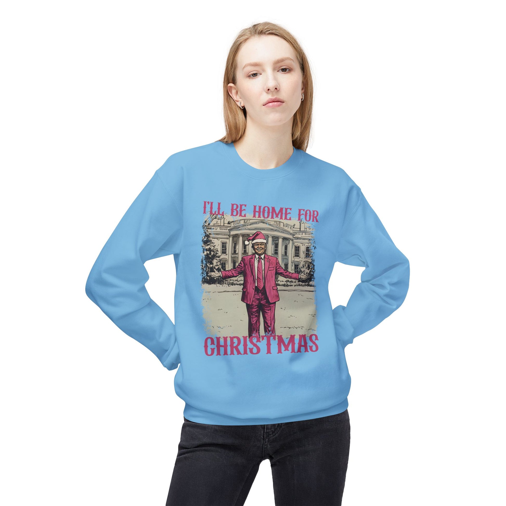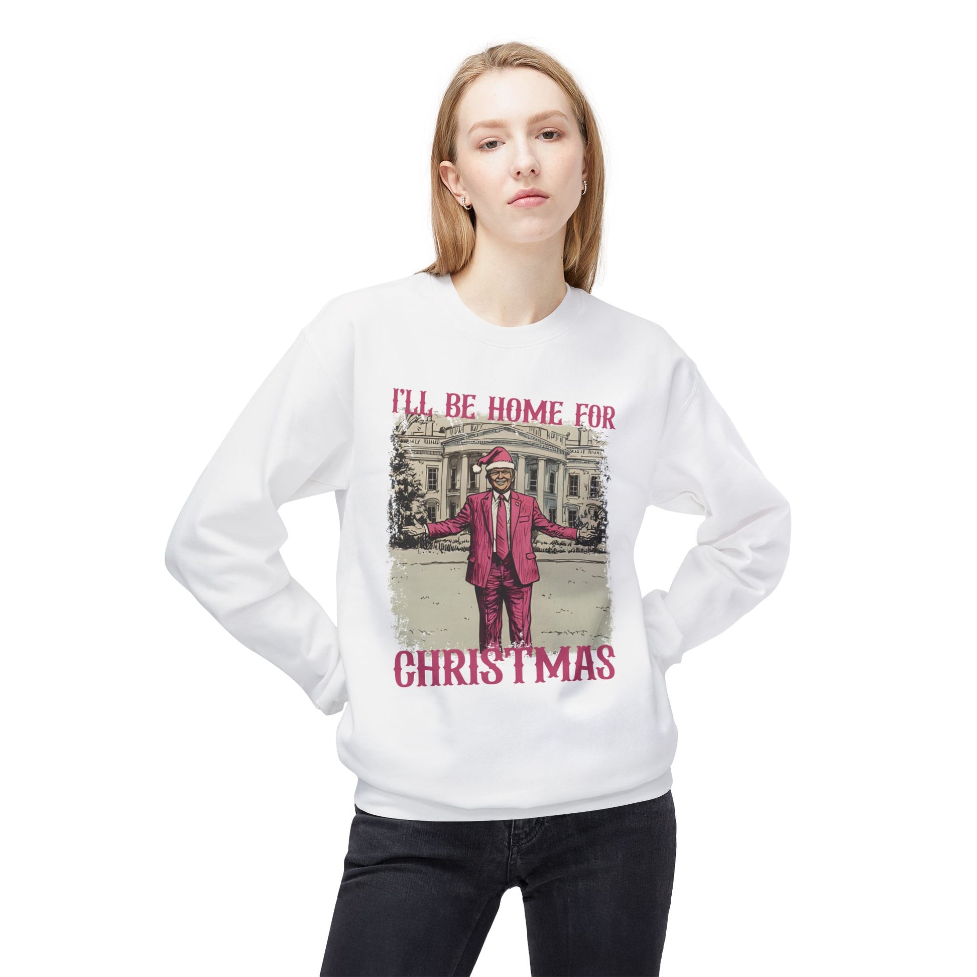 This Donald Trump I'll Be Home for Christmas Sweatshirt exudes a festive and humorous vibe, perfect for the holiday season. It's a great addition to anyone's winter wardrobe, especially for those who enjoy a touch of humor in their clothing. Ideal for Christmas celebrations and parties.