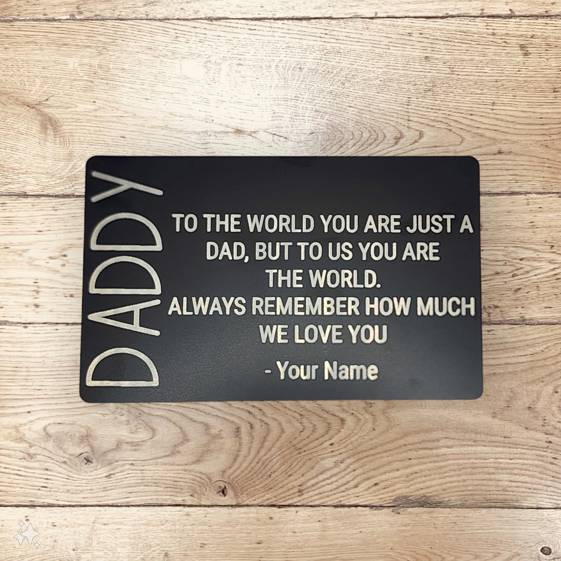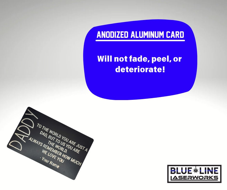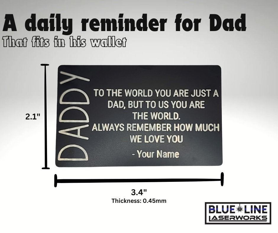These personalized metal wallet cards are perfect for any dad and for any occasion! Whether it's a birthday, Christmas, Father's Day, or just because he's doing a good job as a dad, he'll be sure to love it! Personalize it with your name or names.