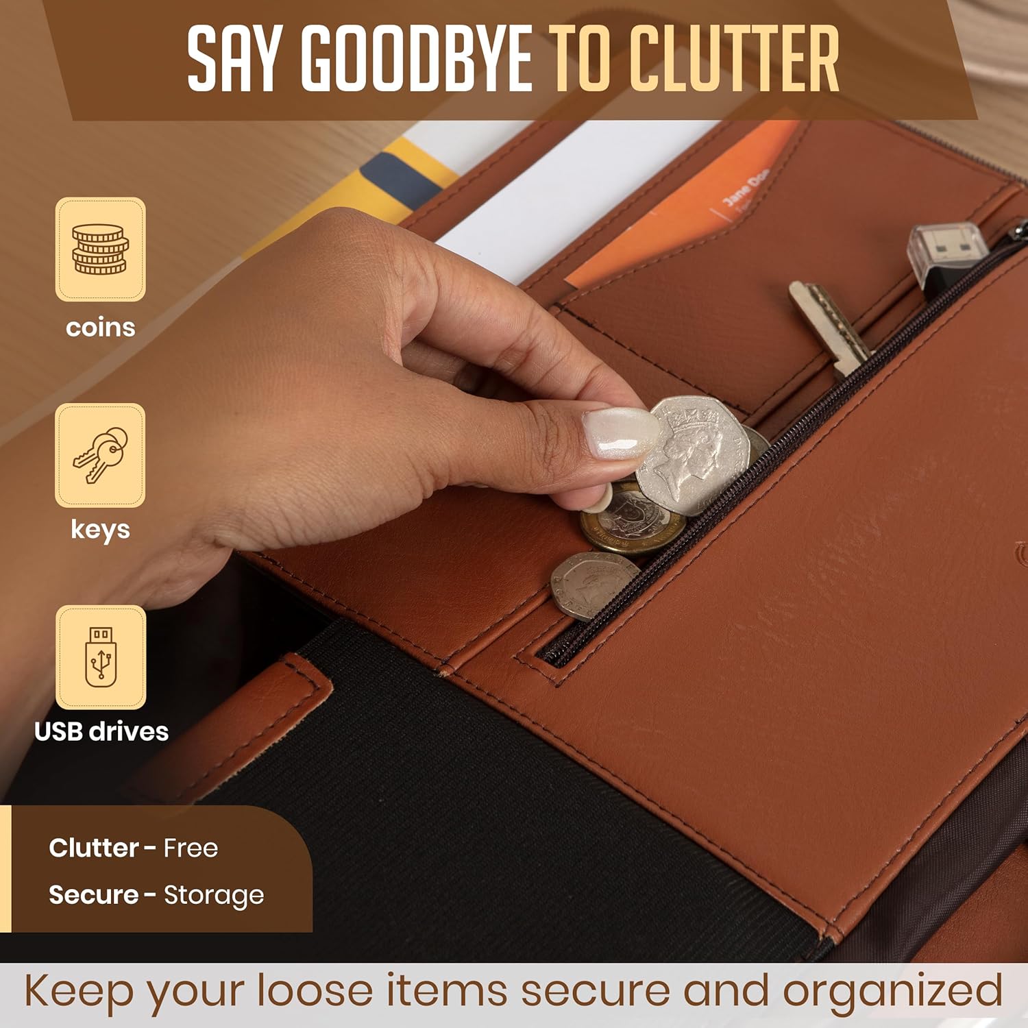 Ample Storage & Organization: Holds a legal‑size or Letter/A4 notepad, tablet sleeve (up to 10″), phone pouch, multiple pockets for manila files, business cards and pens