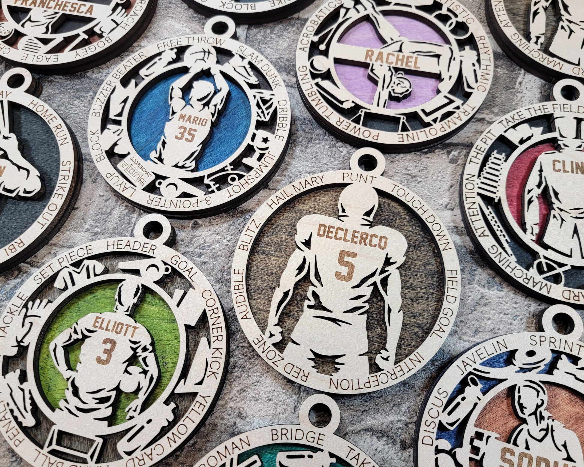Support your favorite sports star with one of these custom ornaments! The ornaments are laser engraved so they will last a lifetime! Choose from one of the many options to decorate your tree with!