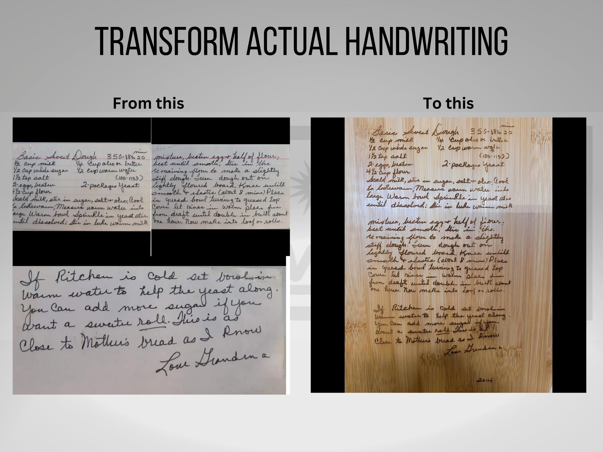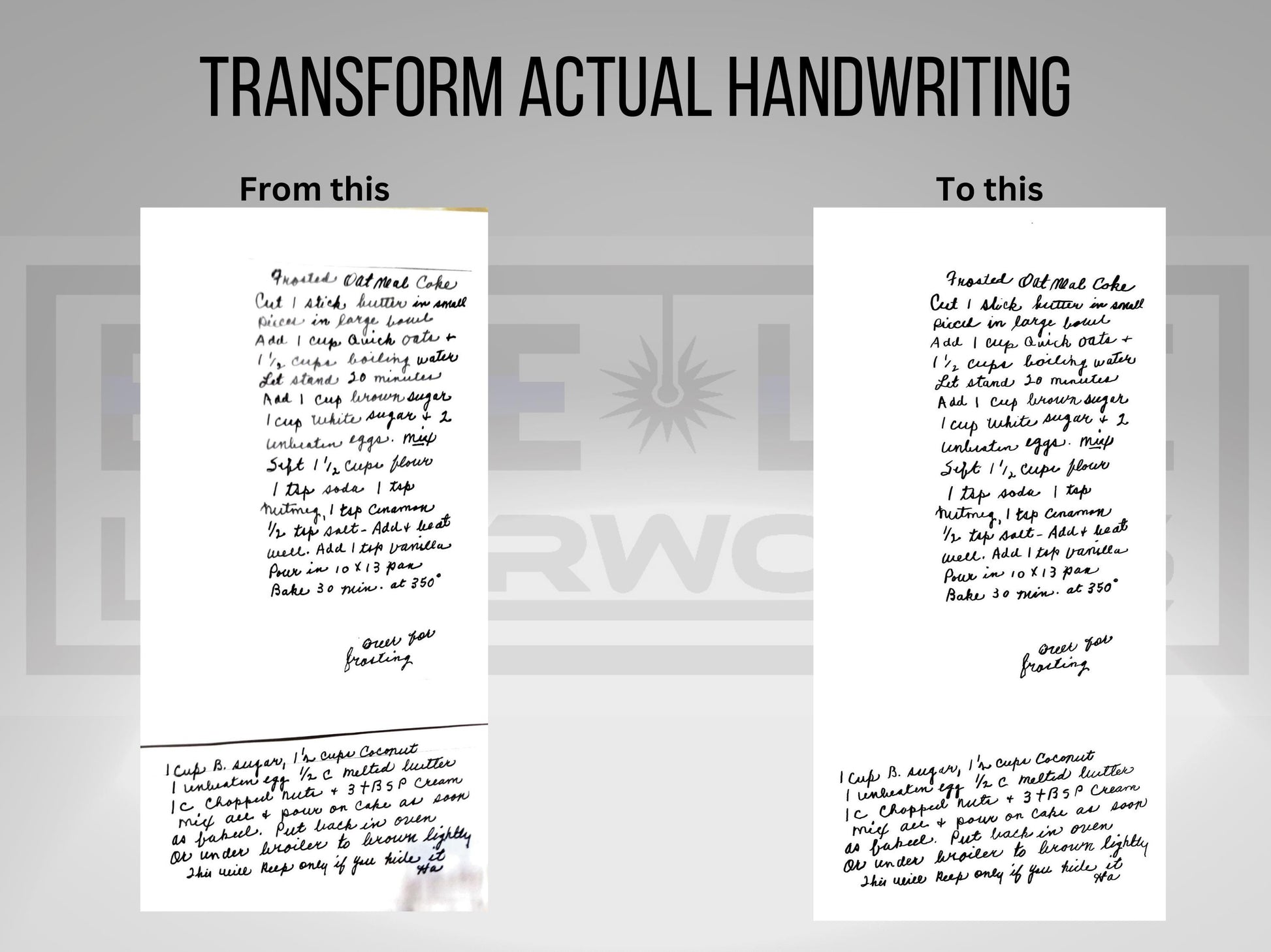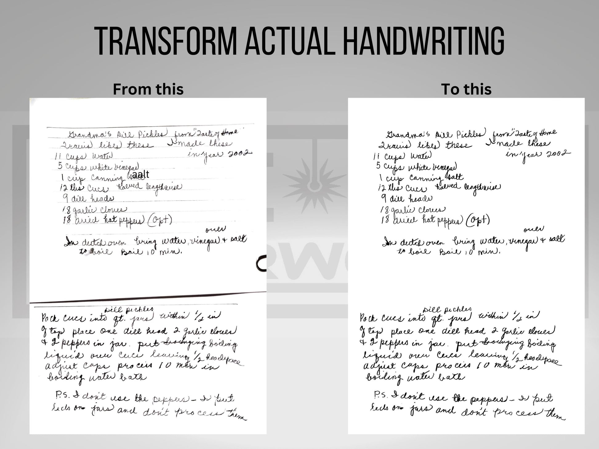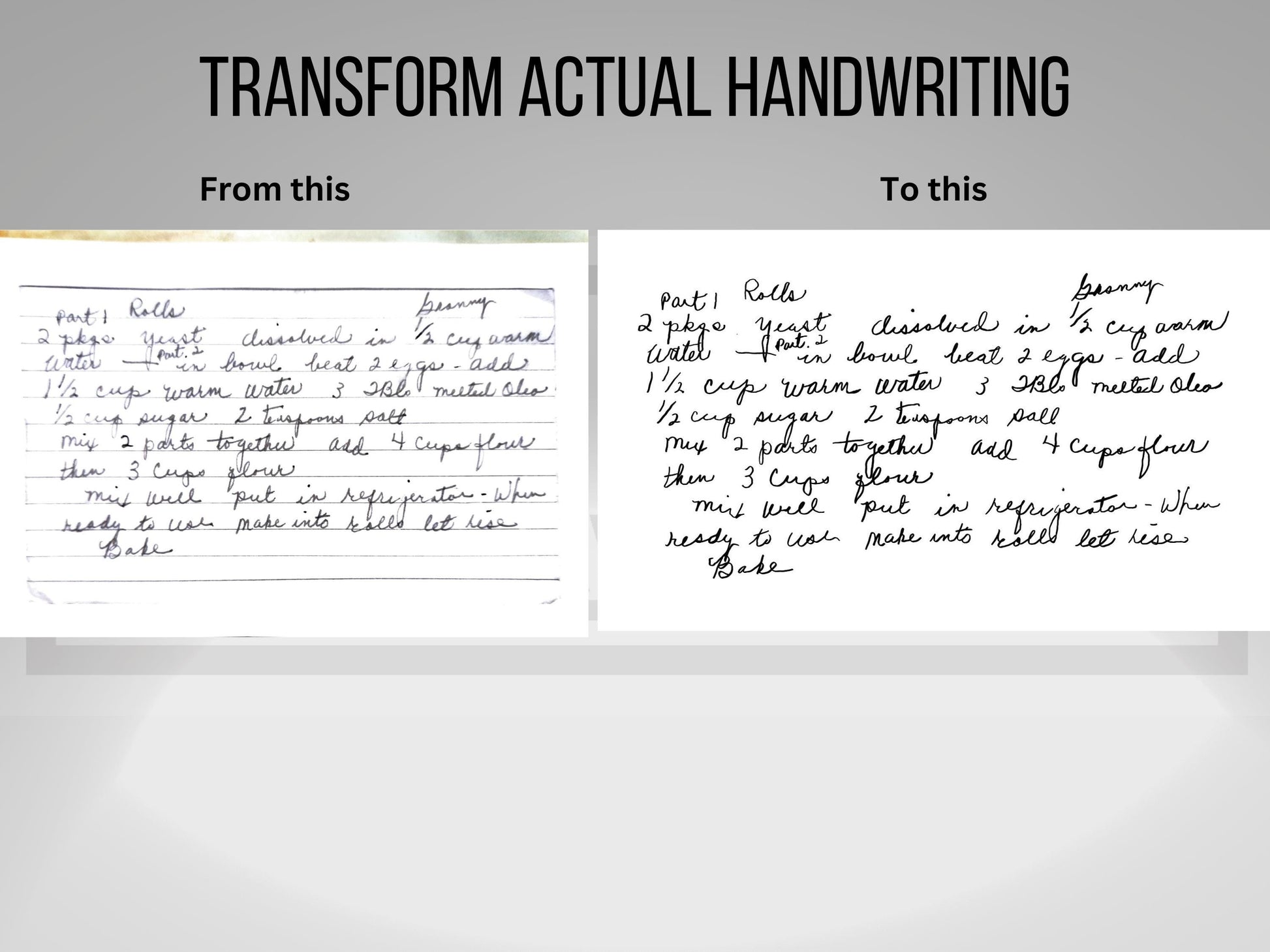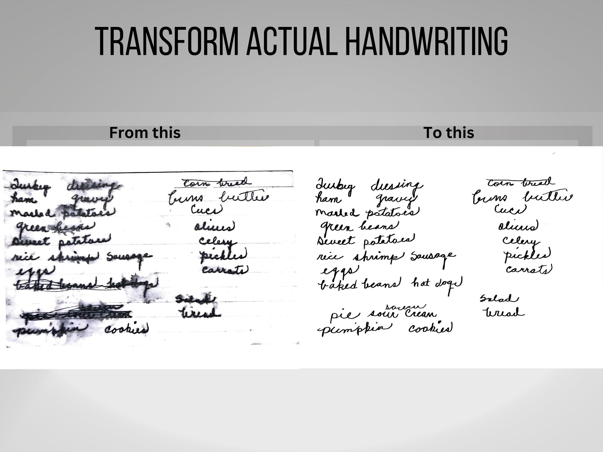 Preserve and repurpose cherished handwriting with our custom handwriting digital conversion service! Whether it’s a handwritten recipe, a heartfelt note, or a personal letter, we transform your high-quality photo or scan into a crisp, clean digital file.