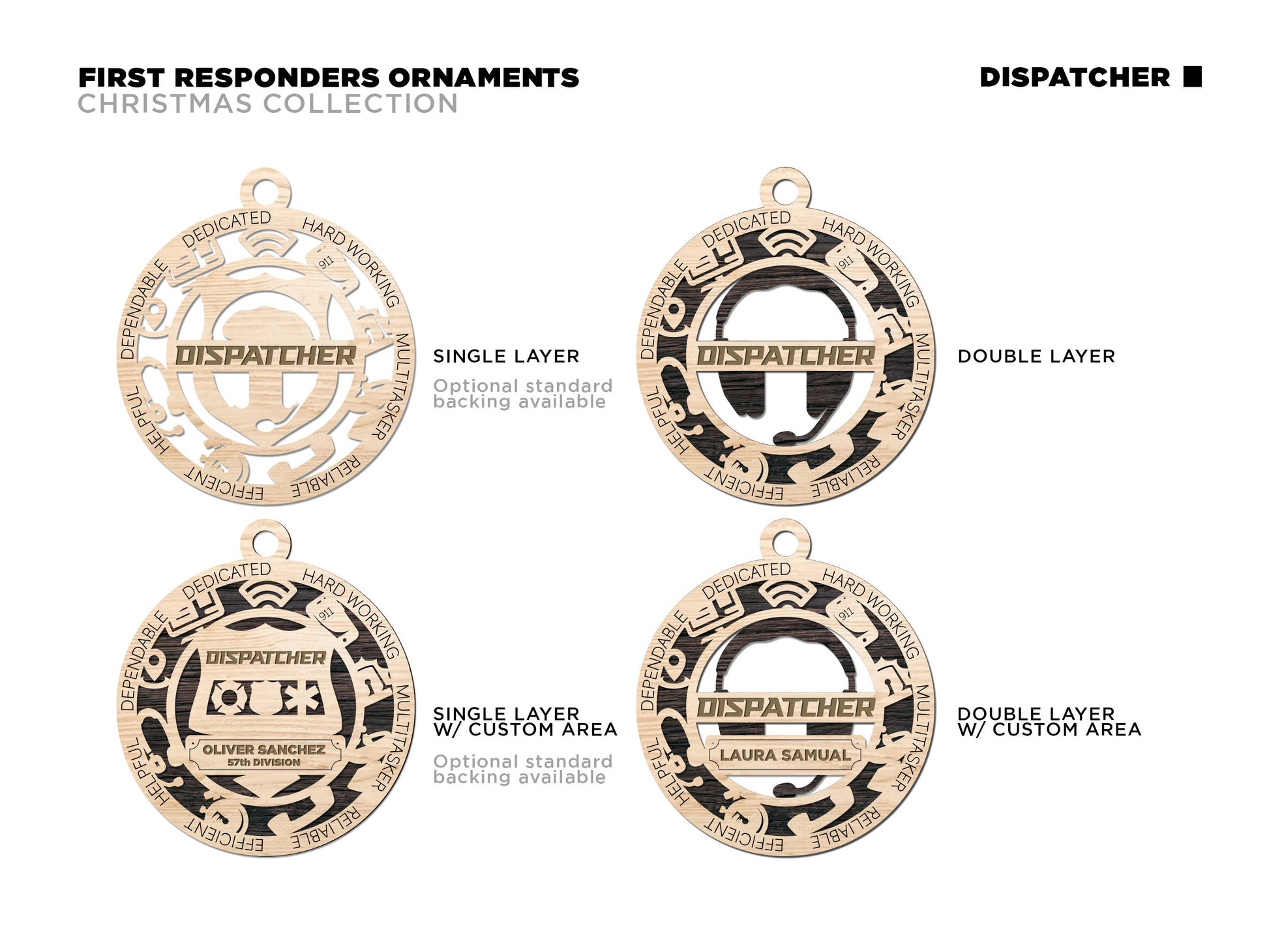 There are four options to choose from, a single layer ornament, personalized or not, and a double layer ornament, personalized or not. They are all beautiful and would make a lovely gift. The dispatcher ornaments will have a gold/black background, unless specified.