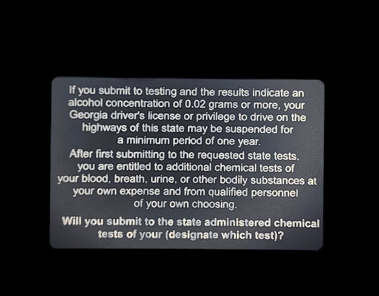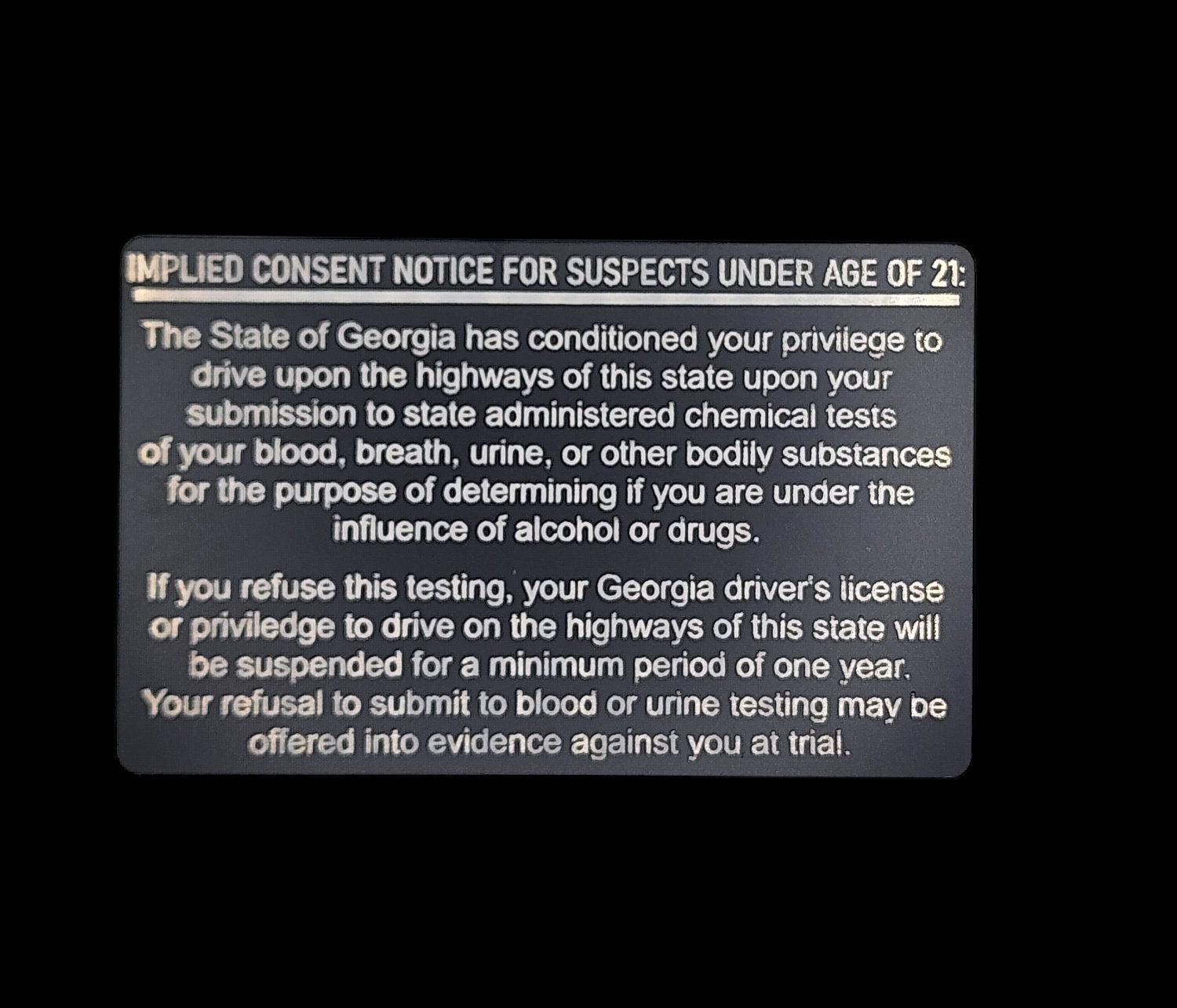 Georgia Under 21 Implied Consent Card - implied consent, georgia, police, sheriff, trooper, dwi, cop, laser engraving