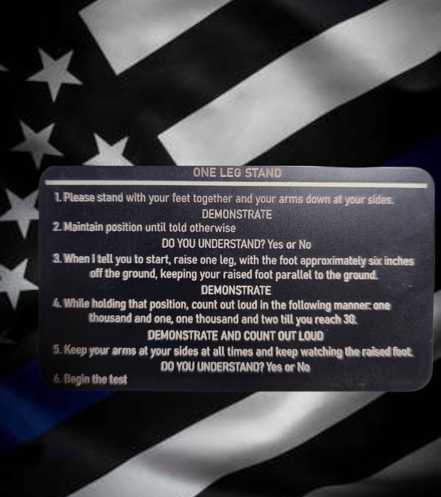 Never be unprepared when you're on duty with this metal, weatherproof, SFST card. Double sided card featuring the walk and turn, and one leg stand tests.