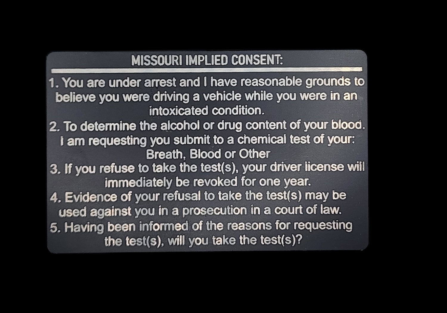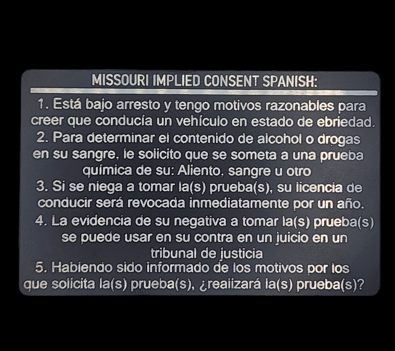 Durable laser engraved anodized aluminum implied consent card. Don't rely on a paper card when you can carry this metal card. This sturdy card features Missouri's implied consent for DWI arrests in English on one side, and Spanish on the other. Never be un-prepared!