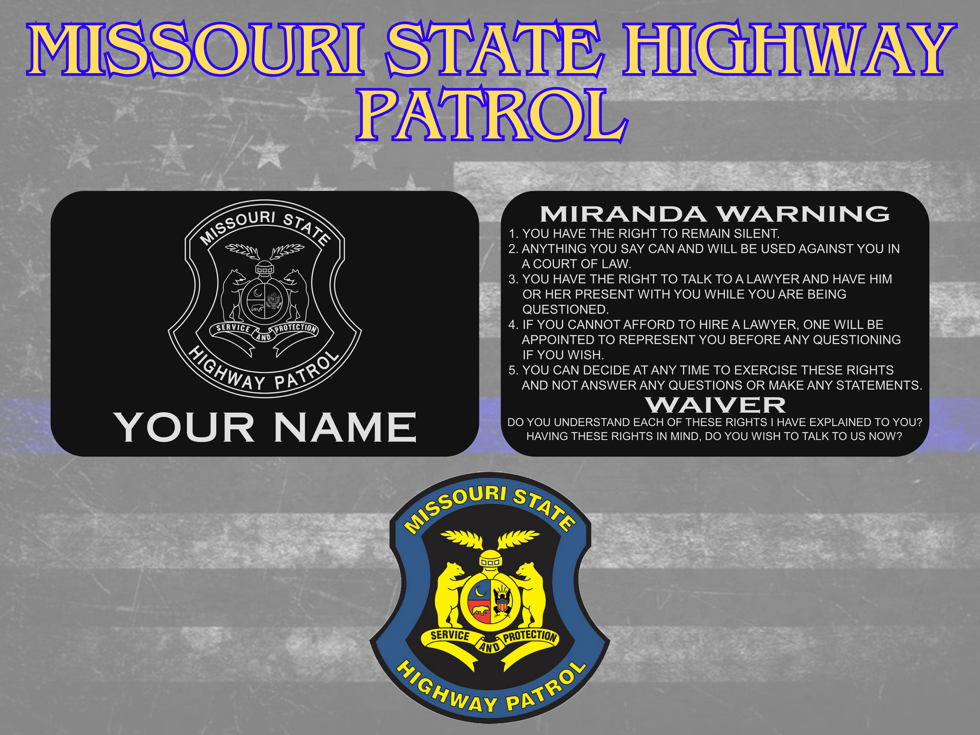 Missouri State Troopers! Durable anodized aluminum Miranda warning card. Don't rely on a paper card when you can carry this. The front is engraved with the MSHP logo, customized with text. The back will contain the full Miranda warning and waiver. If you want your name or text on the bottom, please state in the "personalization box."