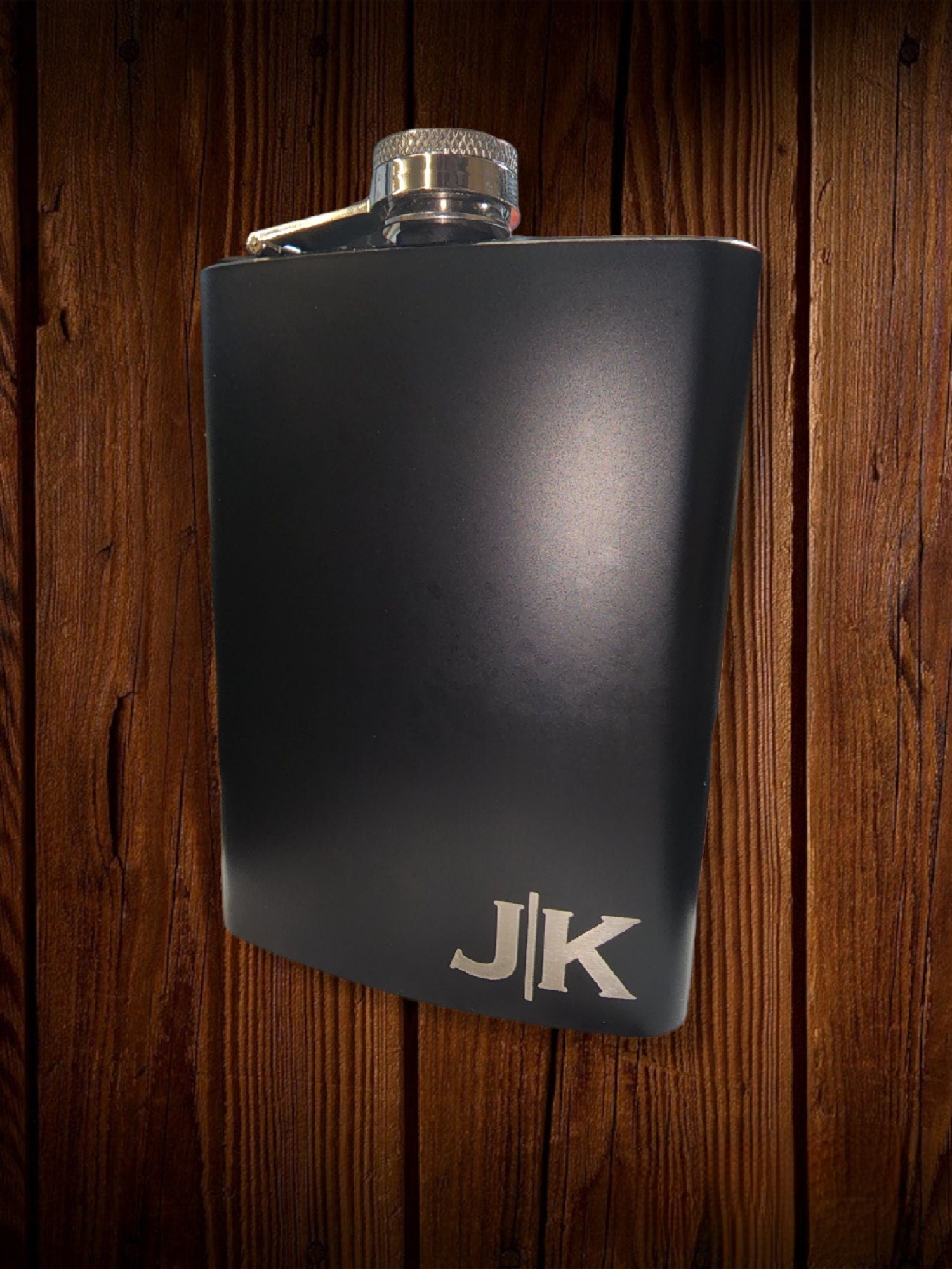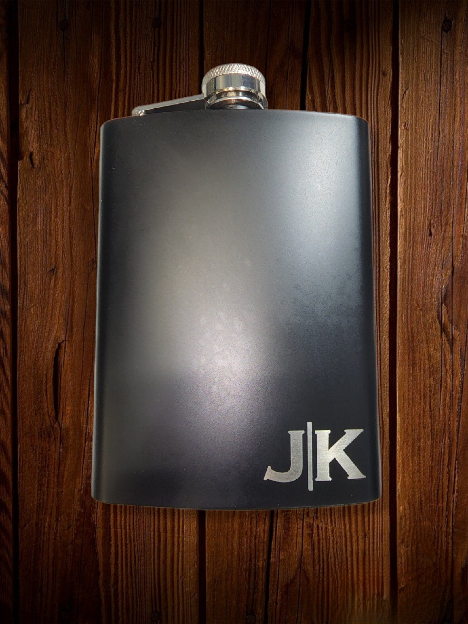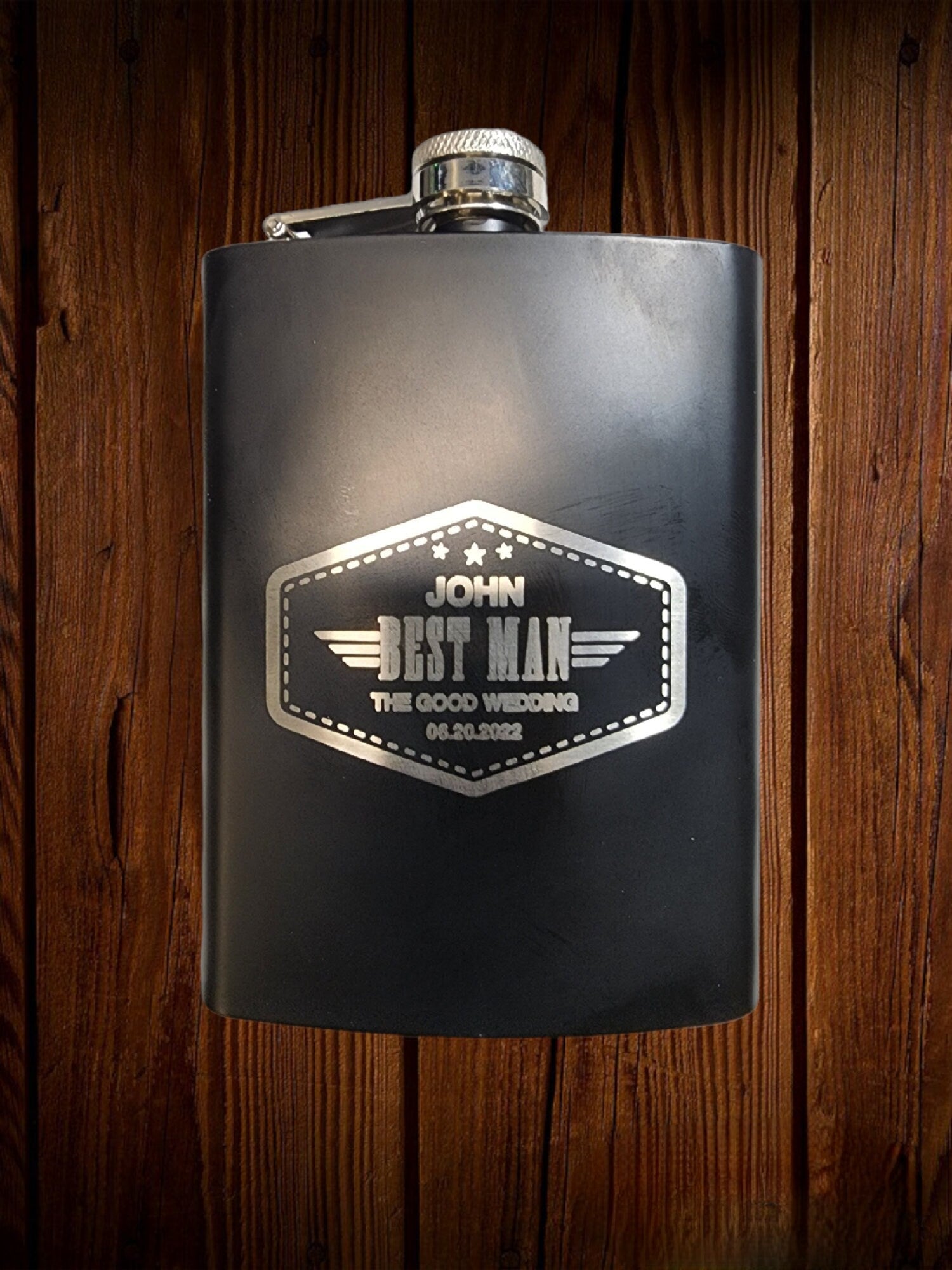 You've found it. The perfect gift for your dude. Your best friend or your best MAN. Father's day? Perfect. Wedding? Perfect. This stainless steel 8oz hip flask will be the perfect gift for any occasion. The black engraves beautifully to show the stainless and is permanent. Personalize with initials, a name, or the popular Top Gun themed wedding logo.