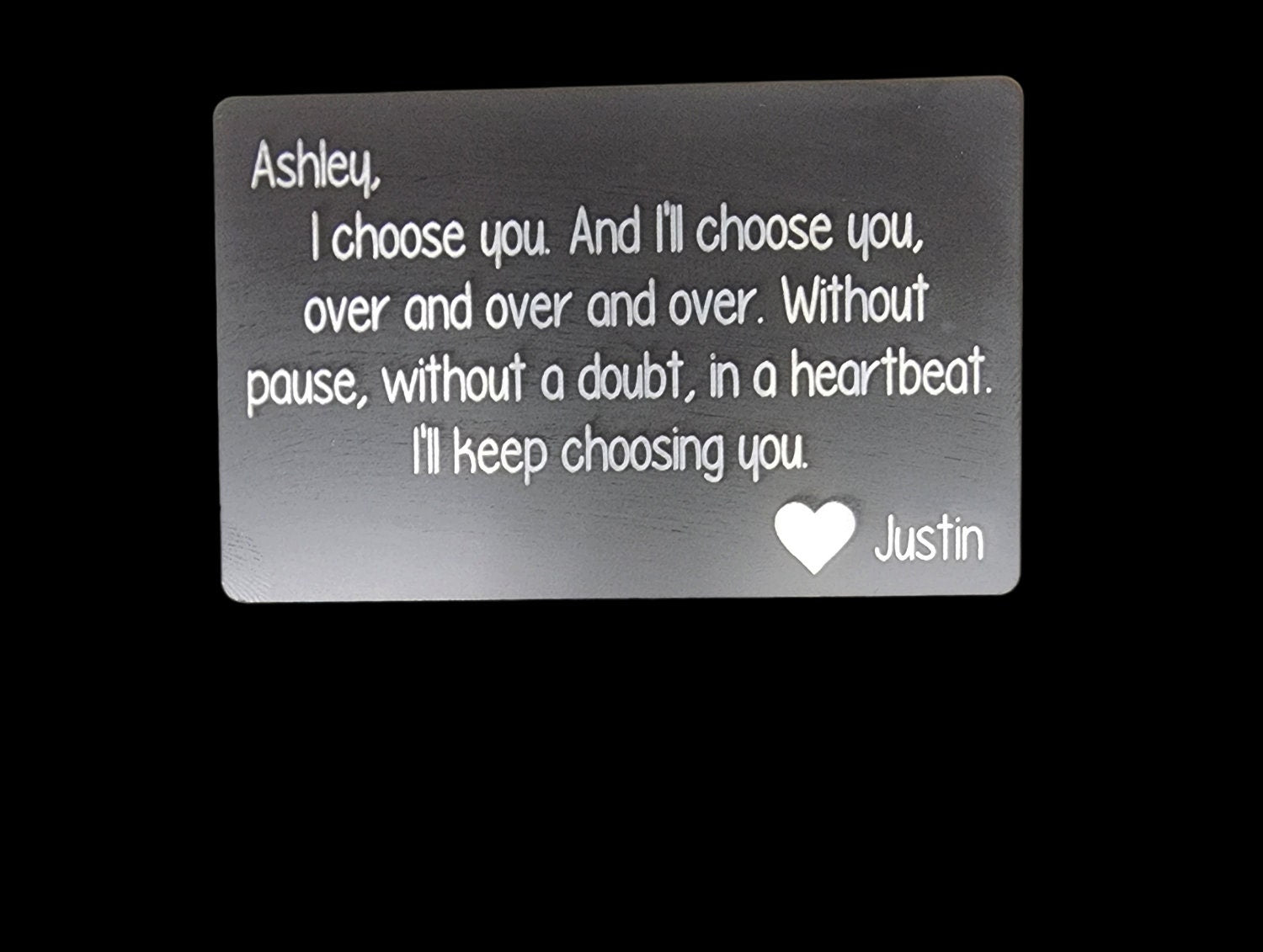 Our personalized metal card will be the perfect gift for any occasion - birthdays, Valentines Day, weddings, anniversary's, Mother's Day, or any day! Show the one you love how special they are. These metal cards are the perfect size to keep in a wallet, or pocket. Remind them you will choose them, and continue to choose them everyday. These cards are laser engraved, so they will not fade.