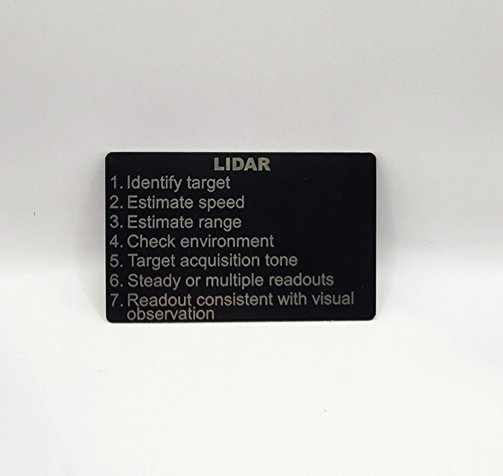 Never be unprepared when you're on duty with this metal, weatherproof, RADAR/LIDAR Speed Tracking History card. Double sided card featuring the RADAR checklist, and the LIDAR checklest.