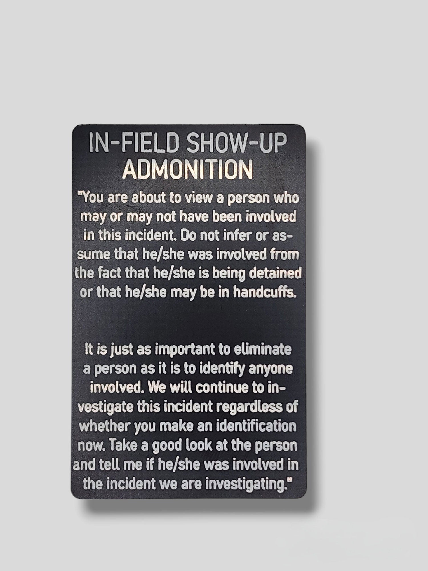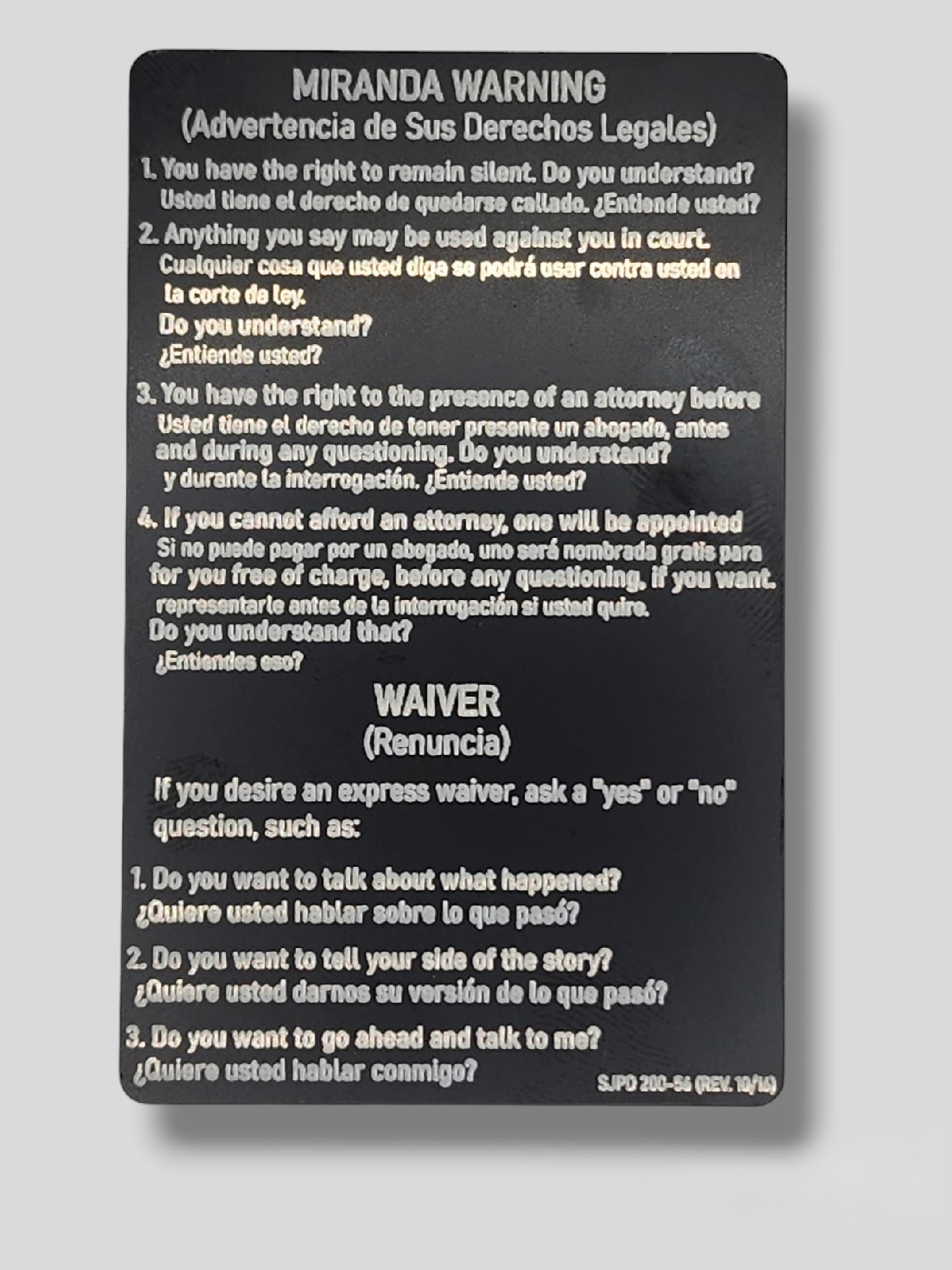 Durable laser engraved anodized aluminum Miranda warning card. Don't rely on a paper card when you can carry this metal card. One side features the Miranda Warning, and the other side features the in-field show-up admonition warning. Never be un-prepared!