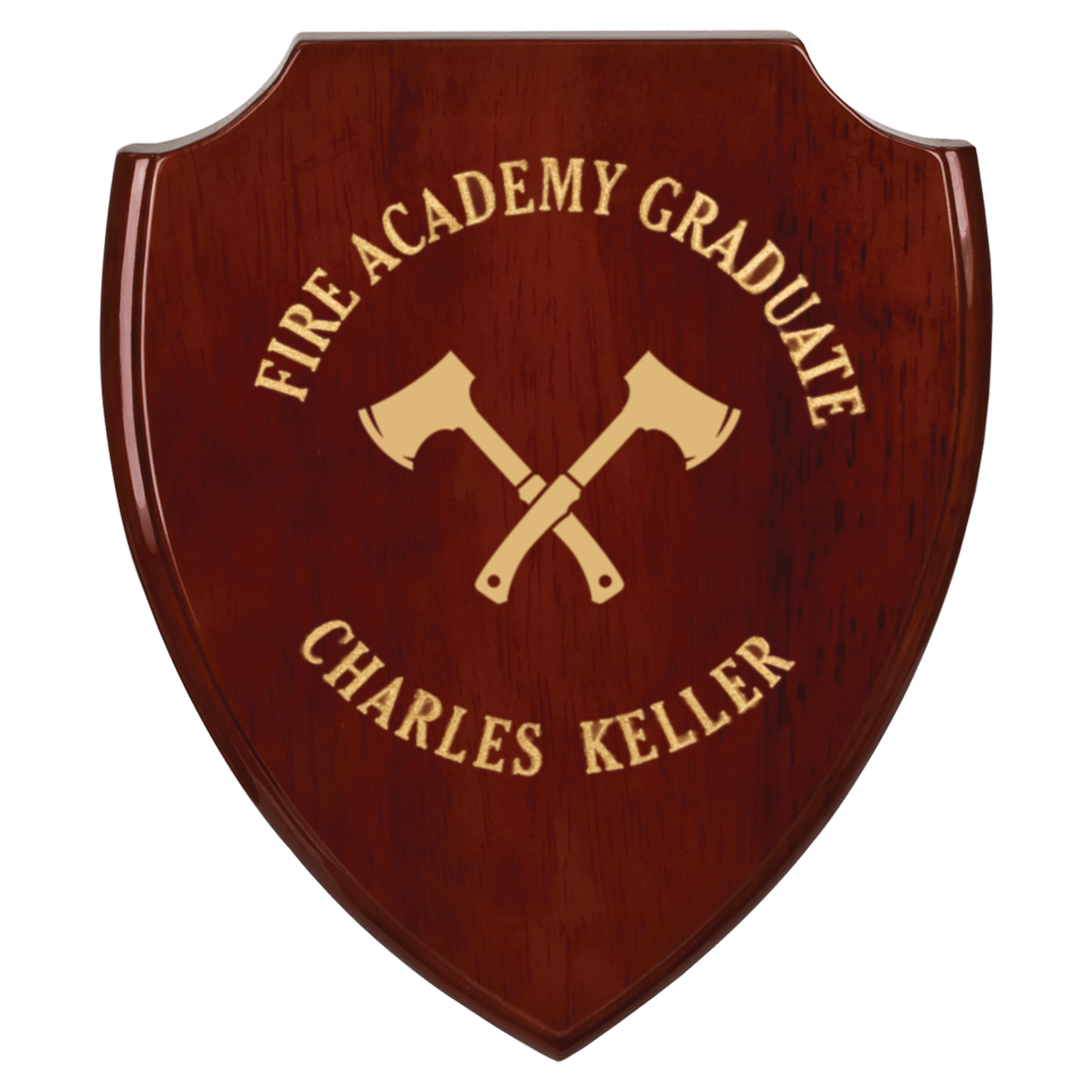 This shield plaque is an ideal choice for fire and police awards, offering a distinguished and professional presentation. Available in multiple sizes, it can be customized as a traditional plaque featuring a metal plate or as a fully engraved wooden shield. Its versatile design ensures a meaningful and lasting tribute for any recognition occasion.