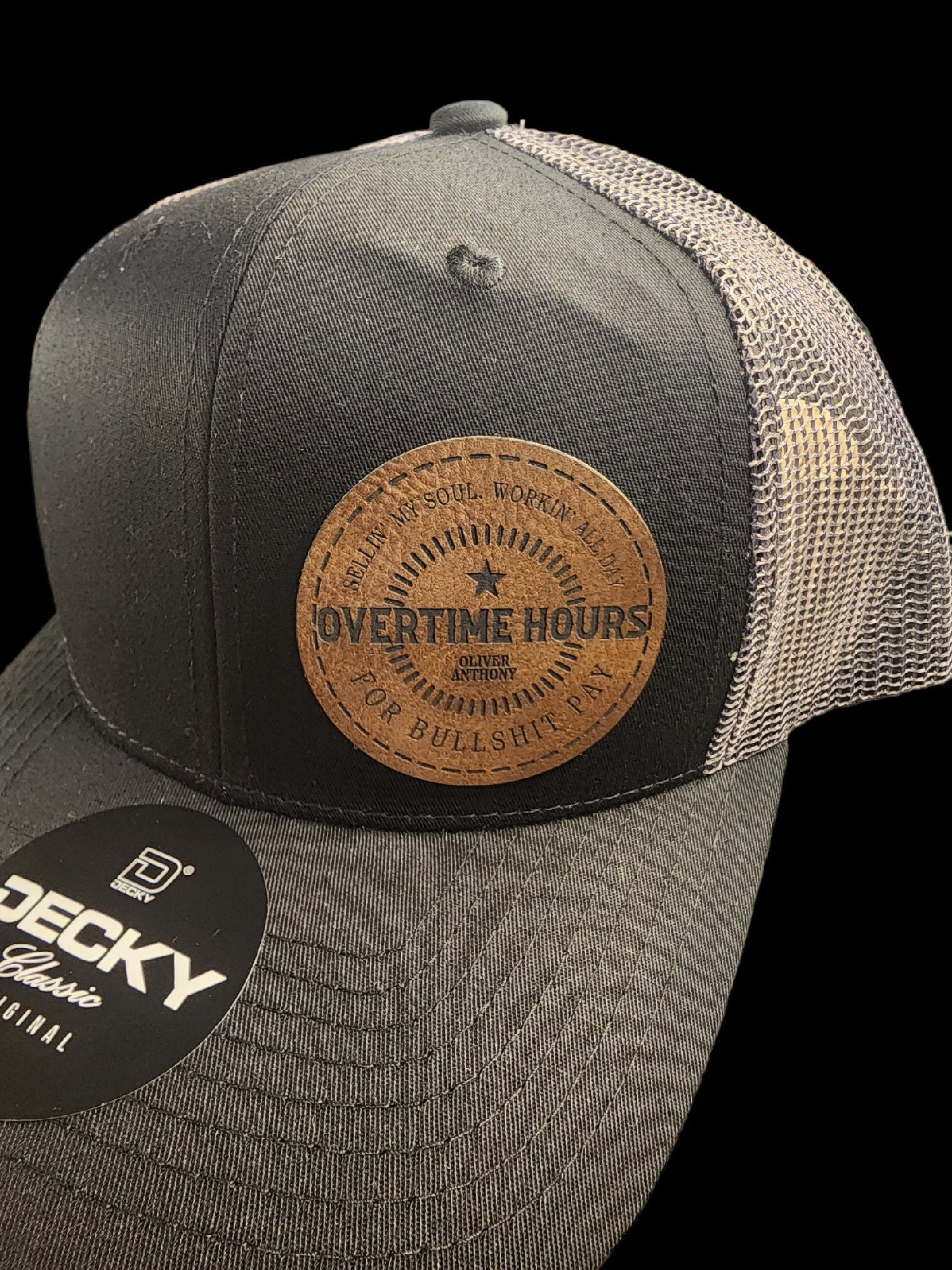 This Decky 6021 black/charcoal hat combined with the leatherette Oliver Anthony patch will be the perfect gift for anyone.